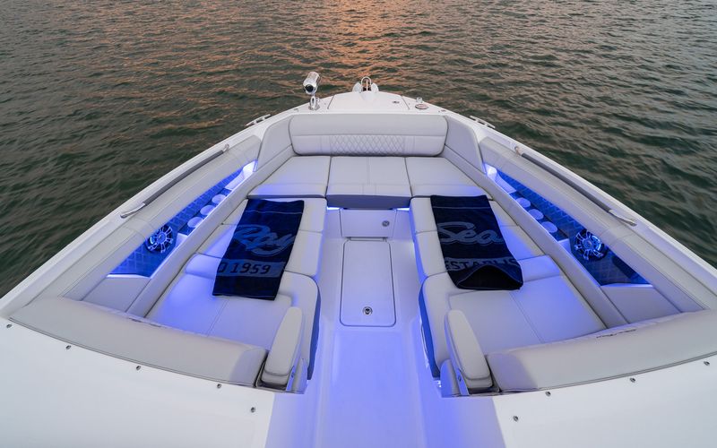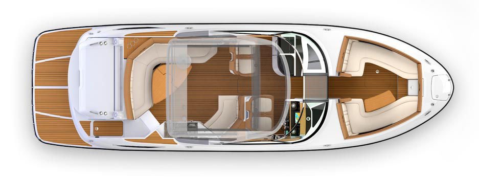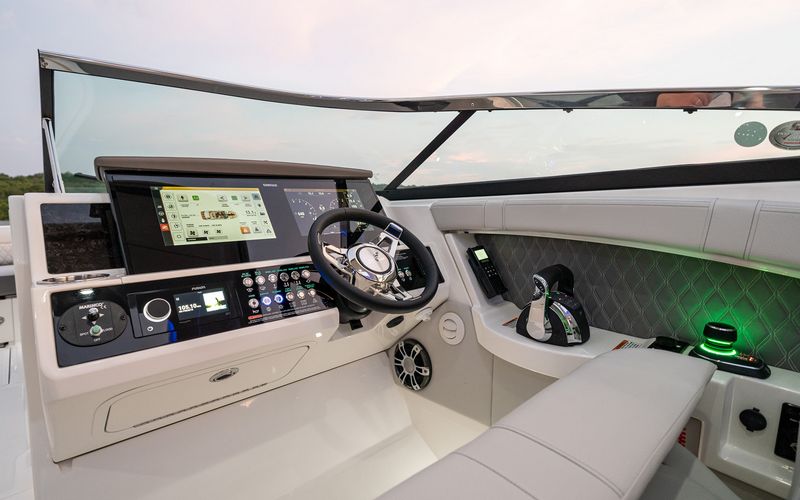 Der Innenborder lässt sich mit zwei 350 PS MAG MPI oder zwei 380 PS 8.2 MAG V8 Motoren von MerCruiser ausstatten. Unabhängig davon ist das Boot optional mit Axius Joystick-Steuerung erhältlich – für ein leichtes An- und Ablegen.