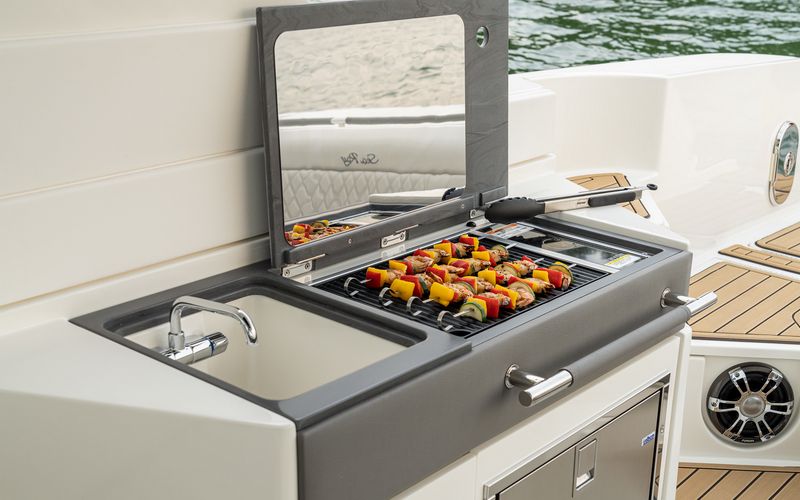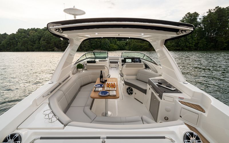 Mehr Raum für Freunde und Familie, mehr Power und Leichtigkeit – mehr Spaß denn je. Die yachtzertifizierte Sea Ray SLX 350 überzeugt in jeder Hinsicht. Eine Standard-Bar mit Kühlschrank sorgt für Erfrischung. Die geräumige Nasszelle mit Dusche für Komfort auf langen Tagestouren. Hinzu kommen eine Reihe von Sea Ray’s Next Wave™ Innovationen: Die geräuschdämpfenden Fähigkeiten von Quiet Ride™, die Präzision der dynamischen Lauffläche und die Agilität der Axius® Joystick-Technologie heben den Fahrspaß auf die nächste Stufe. Alle intelligenten Funktionen vereinen sich zu einem beeindruckenden Paket, das die Erwartungen übertrifft. Kurz gesagt, dank der SLX 350 verbringen Sie zukünftig noch mehr Zeit auf dem Wasser – garantiert!