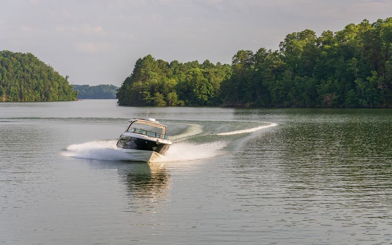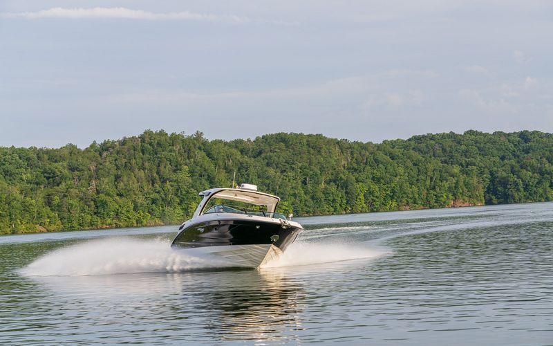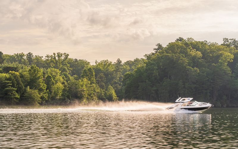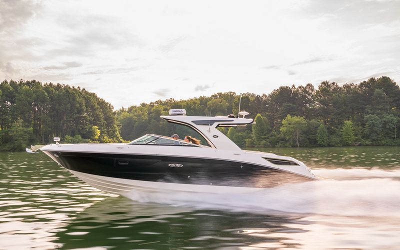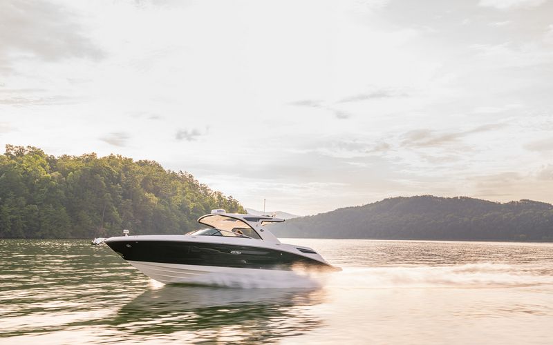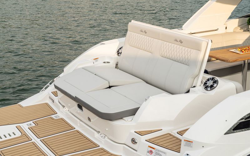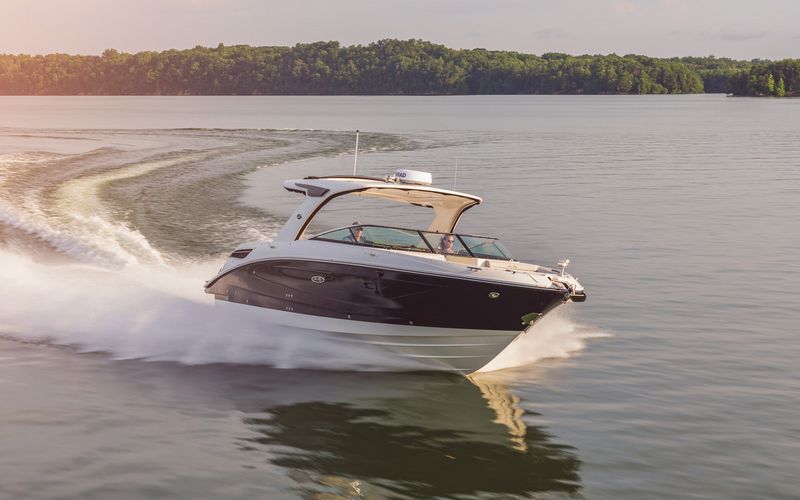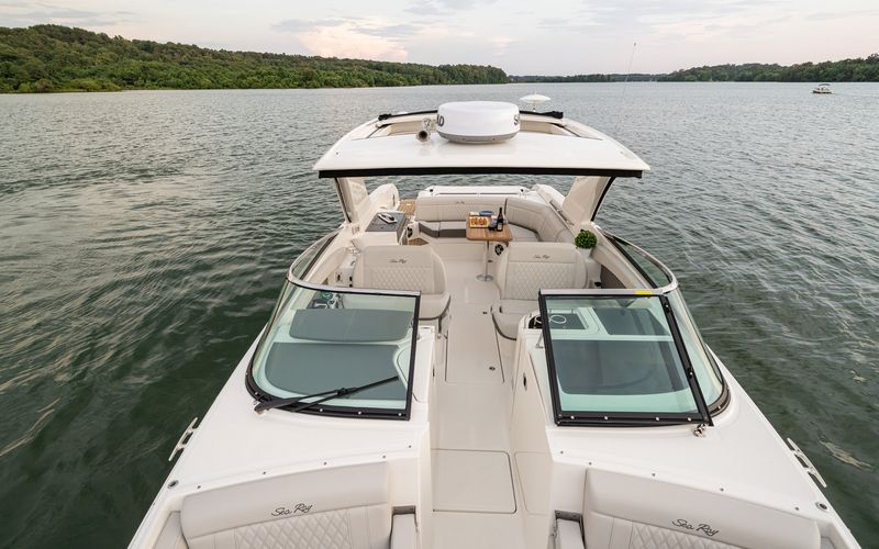 Die Sea Ray 350 SLX erreichte im Test mit zwei 380 PS Motoren und sechs Personen an Deck eine Höchstgeschwindigkeit von fast 80 Stundenkilometern. Auch enge Kurven und leichten Wellengang meistert der stabile Bowrider mit tiefen V-Rumpf mühelos. Die Quiet-Ride-Technologie sorgt dabei für eine deutlich geringere Lärmentwicklung.