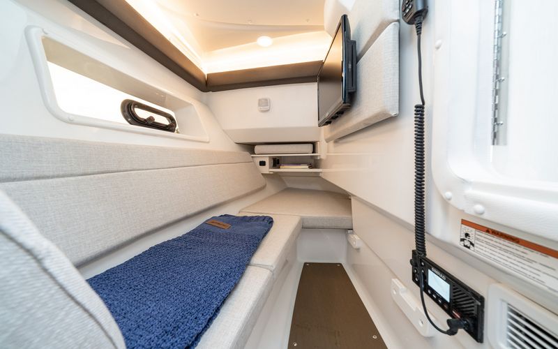 Über eine Klappe in der Windschutzscheibe betreten Sie den Bug. Auf den zwei Bänken können sechs Personen sitzen oder zwei liegen. Mit Füllpolstern kreieren Sie hier eine breite Liegefläche.