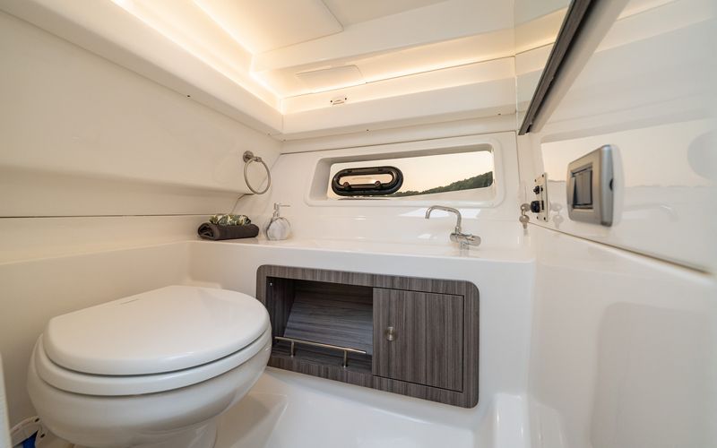 In der Konsole auf Steuerbordseite bietet ein großer begehbarer Stauraum reichlich Platz für Rettungswesten und Sportausrüstung. Gegenüber befindet sich eine geräumige Nasszelle mit Dusche und Toilette.