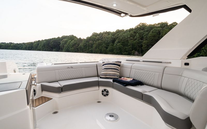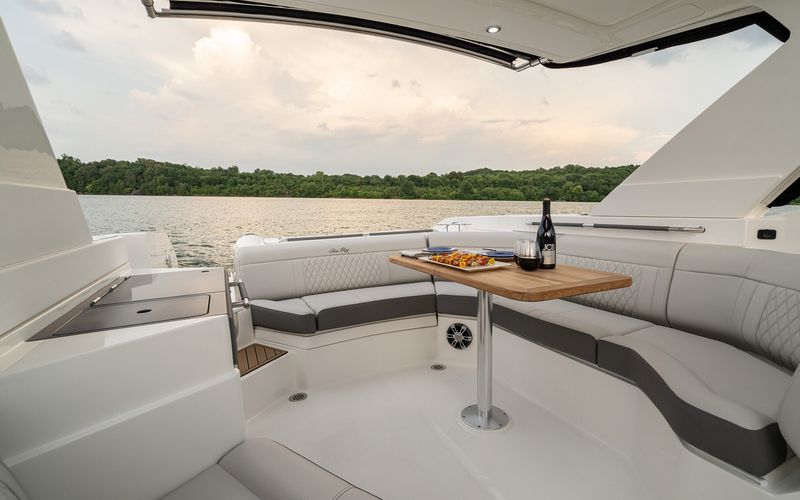 Eine durchdachte Raumaufteilung nutzt den verfügbaren Platz bestens aus. So haben auf der Sea Ray 350 SLX bis zu 18 Personen Platz: Allein im Cockpit sitzen Sie bequem mit bis zu zehn Personen zusammen. Weitere Sitzplätze befinden sich im Bug. Und dann wären da noch die zweisitzige Fahrerbank und die rückwärtigen Heckplätze.