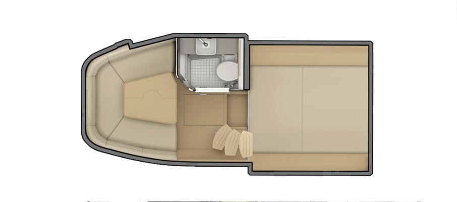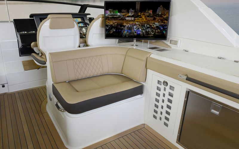 Im Cockpit erwartet Sie wiederum eine große Sitzecke mit Tisch und L-förmiger Bank, die Sie nach hinten zur Heckliege erweitern können. Zudem lässt sich die Beifahrerbank nach hinten ausrichten. Gegenüber der Sitzgruppe erlaubt eine weitere kleine Bank die Kommunikation in großer Runde. Dank Bartresen mit Spüle, Kühlschrank und Grill ist die Verpflegung ebenfalls gesichert.