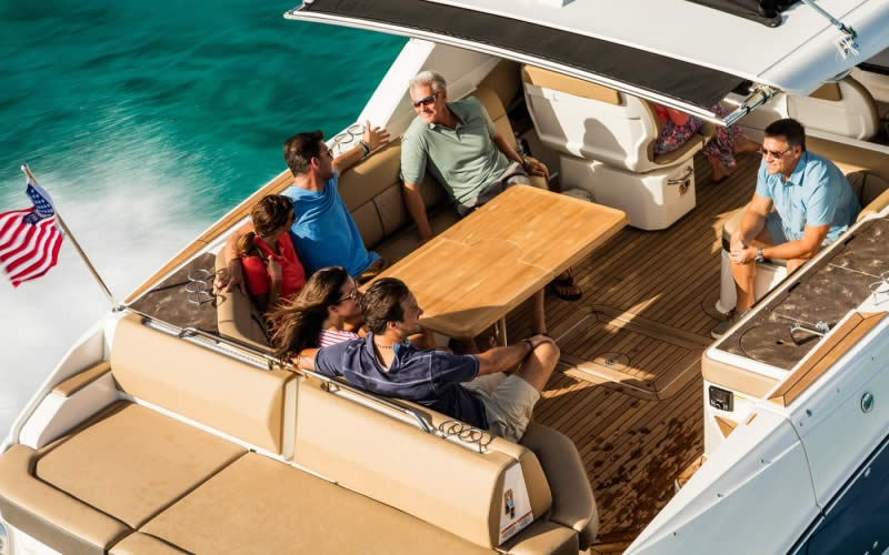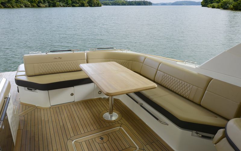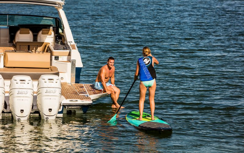 Hinter der breiten Heckbank bietet die Sea Ray 400 OB um die Außenborder zwei Badestege, die wie die gesamte Cockpit-Terrasse mit Teak beplankt sind. Zusätzlich lässt sich die Steuerbordseite nach Außen ausklappen. So kreieren Sie hier eine große Badeplattform – in sicherem Abstand von den Motoren. Passend hierzu können Sie die flexible Heckbank auch zur Seite ausrichten, um beispielsweise Ihre badenden Kinder zu beaufsichtigen. Unter der Heckklappe bleibt zudem enorm viel Platz für Ihre Ausrüstung, sogar für Surfboards.